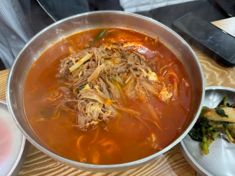 육개장 칼국수는 매콤하면서도 깊은 맛이 나서, 한 입 먹는 순간 입안에서 풍미가 퍼지는 느낌이었어요. 고기와 채소가 아낌없이 들어가 있어 든든한 한 끼가 되었답니다.