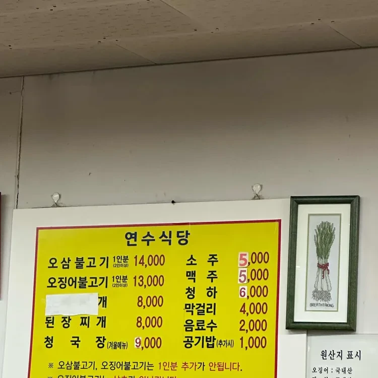 연수식당의 메뉴는 다양하고 가격도 합리적이에요. 특히 추천하고 싶은 메뉴는 '오삼불고기'와 '오징어불고기'인데요, 각각 14,000원과 13,000원으로 가격도 부담스럽지 않아요. 이 외에도 다양한 사이드 메뉴가 준비되어 있어, 소주나 맥주와 함께 즐기기 좋답니다. 사이드 메뉴는 소주와 맥주가 각각 5,000원, 청하가 6,000원, 음료수는 2,000원, 공기밥은 1,000원이에요.