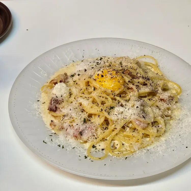 - 스파게티 카르보나라 : 크리미한 소스와 바삭한 판체타가 어우러진 파스타로, 중앙에 놓인 노른자가 풍미를 더해줘요.