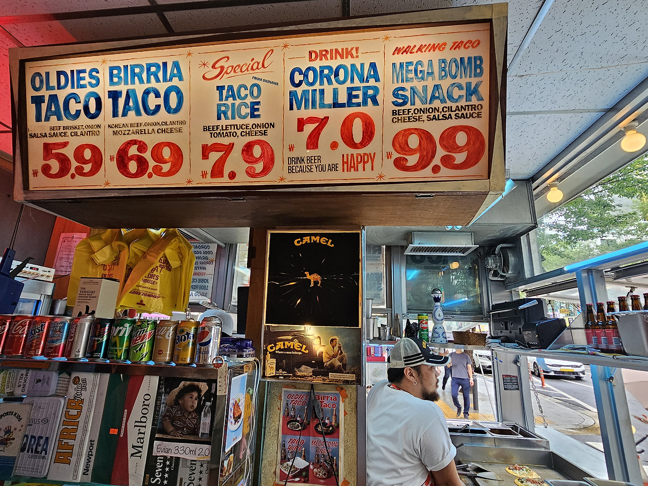 올디스타코의 메뉴는 정말 다양해요. 특히 추천하고 싶은 메뉴는 '올디스타코', '비리아 타코', 그리고 '타코 라이스'예요. 가격은 각각 9.9달러, 6.9달러, 5.9달러로, 가성비도 뛰어나요.