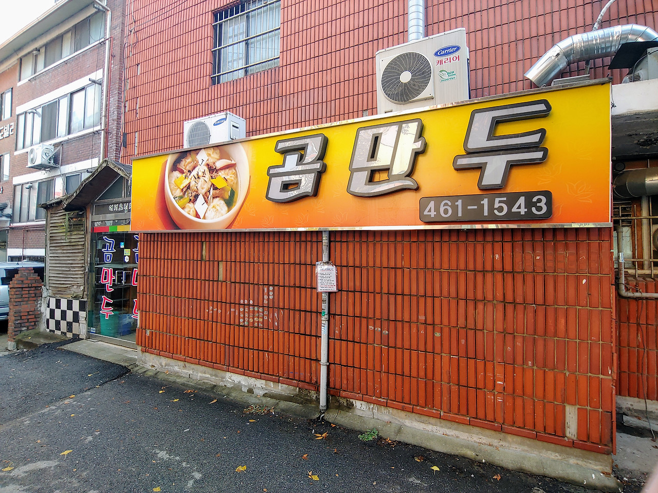 식당의 간판은 밝은 오렌지색으로 눈에 띄고, 만두가 그려져 있어 어떤 음식을 주로 하는지 한눈에 알 수 있어요. 전화번호도 적혀 있어 방문하기 전에 문의하기도 편리하답니다.