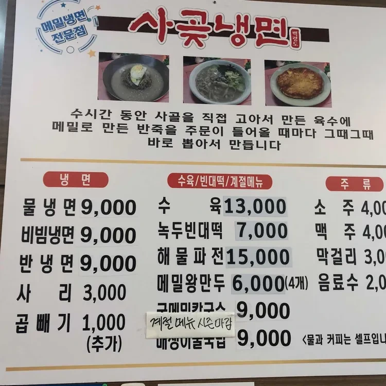 사곶냉면의 메뉴는 다양해요. 기본적으로 물냉면, 비빔냉면, 반냉면이 있으며, 가격은 모두 9,000원으로 통일되어 있어요. 추가로 사리(면 추가)는 3,000원, 곱빼기(대량 주문)는 1,000원에 제공된답니다. 사이드 메뉴로는 김치와 같은 반찬도 함께 나와요.