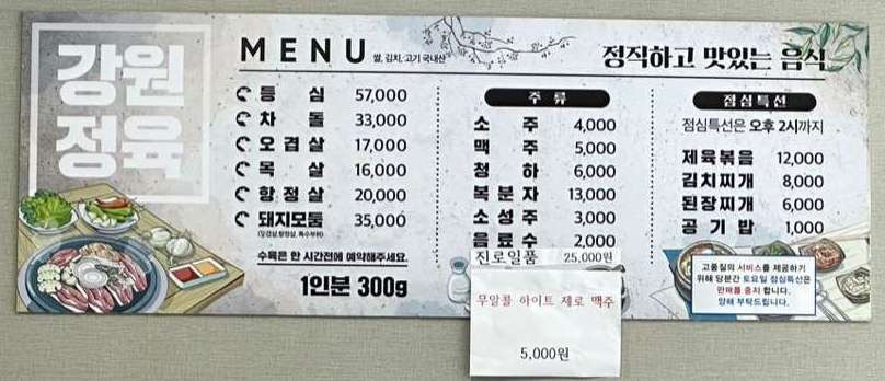 강원정육식당의 메뉴는 다양해요. 주로 돼지고기와 소고기를 중심으로 한 다양한 부위가 준비되어 있답니다. 특히 오겹살이 인기인데, 1인분에 300g이 제공되며 가격은 16,000원부터 시작해요.