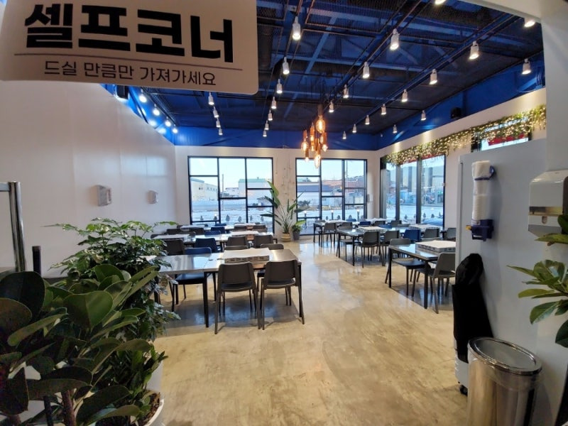 식당 내부는 현대적이고 깔끔한 인테리어로 꾸며져 있어요. 화이트와 블루의 조화가 돋보이는 공간은 밝고 쾌적한 분위기를 자아내요. 큰 창문으로 들어오는 자연광이 식사를 더욱 즐겁게 만들어 주고, 테이블 간격도 넉넉해 편안하게 대화할 수 있는 환경이에요.