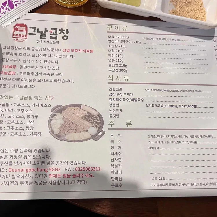 그날곱창의 메뉴는 정말 다양해요. 특히 추천하고 싶은 메뉴는 '모둠곱창'이에요. 가격은 59,000원으로, 2인이서 충분히 즐길 수 있는 양이에요. 모둠곱창은 여러 종류의 곱창이 함께 나와서 다양한 맛을 경험할 수 있어요. 그리고 '볶음밥'도 꼭 드셔보세요! 치즈가 듬뿍 올라간 볶음밥은 정말 맛있답니다. 가격은 8,000원이에요.