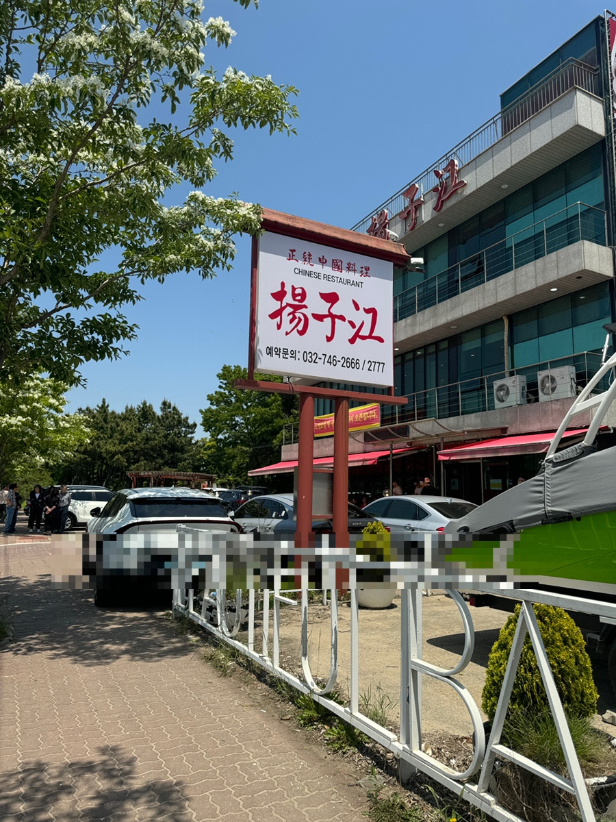 양자강은 인천 영종도 을왕리 해수욕장 근처에 위치해 있어요. 이곳은 바다와 가까워서 식사 후에 산책하기에도 좋은 위치랍니다. 식당 외관은 현대적인 디자인으로, 큰 창문과 붉은 색의 차양이 인상적이에요.