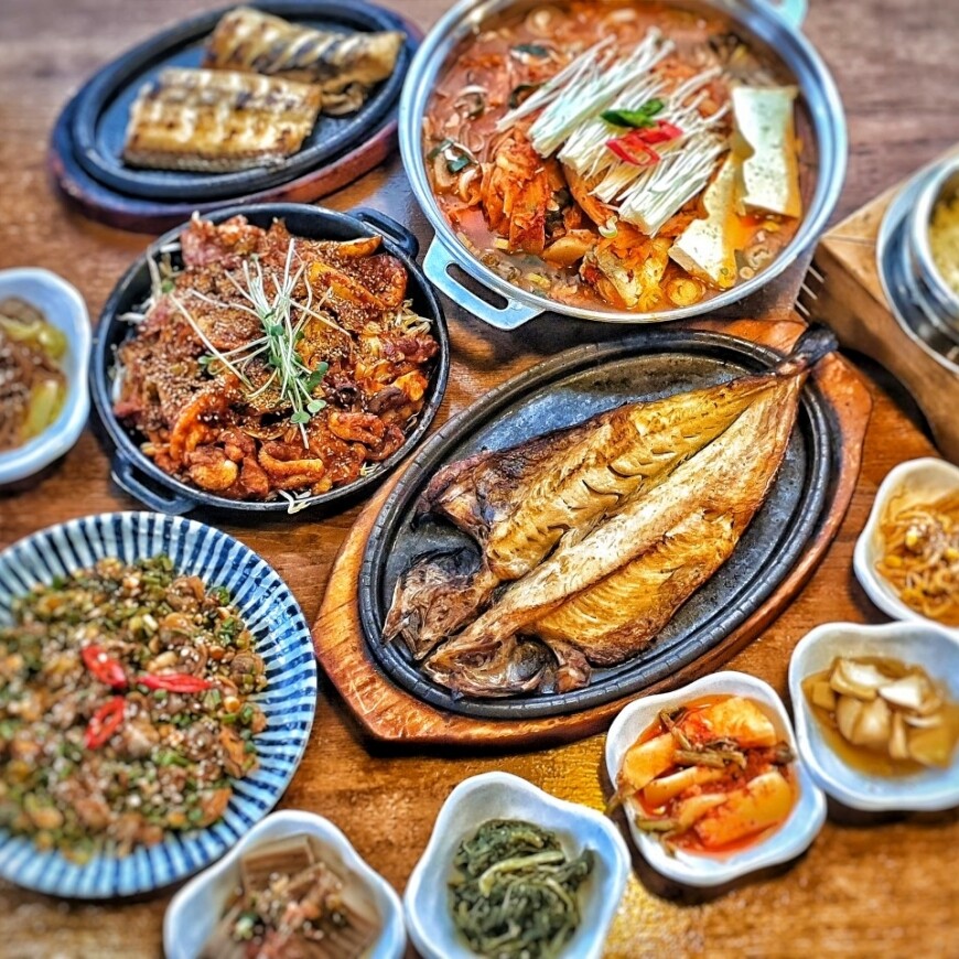 식사와 함께 제공되는 다양한 반찬들도 매력적이에요. 김치, 절임 채소, 그리고 구운 생선이 함께 나와서 풍성한 한 끼를 즐길 수 있어요.