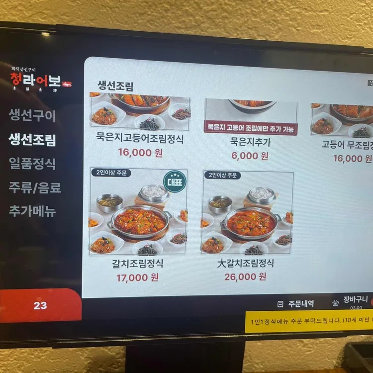 청라조림의 메뉴는 해산물 중심으로 구성되어 있어요. 특히 추천하는 메뉴는 "목은지고등어조림정식"과 "고등어 무조림정식"이에요. 가격은 각각 16,000원으로, 신선한 재료를 사용하여 깊은 맛을 자랑해요. 추가로 "목은지"를 6,000원에 주문할 수 있어요. 또한, "갈치조림정식"은 17,000원, "대갈치조림정식"은 26,000원으로 두 사람 이상이 함께 즐기기 좋은 메뉴에요.