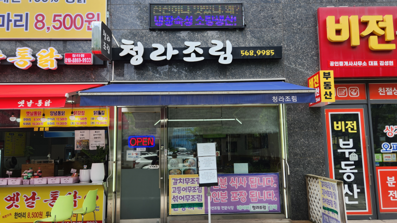 인천 청라조림은 인천의 청라국제도시 근처에 위치한 맛집으로, 신선한 해산물 요리를 전문으로 하는 곳이에요. 이곳은 특히 조림 요리로 유명하며, 다양한 해산물 메뉴를 제공하고 있어요. 청라조림의 외관은 푸른색 차양이 인상적이며, 식당 앞에는 큰 간판이 있어 쉽게 찾을 수 있어요.