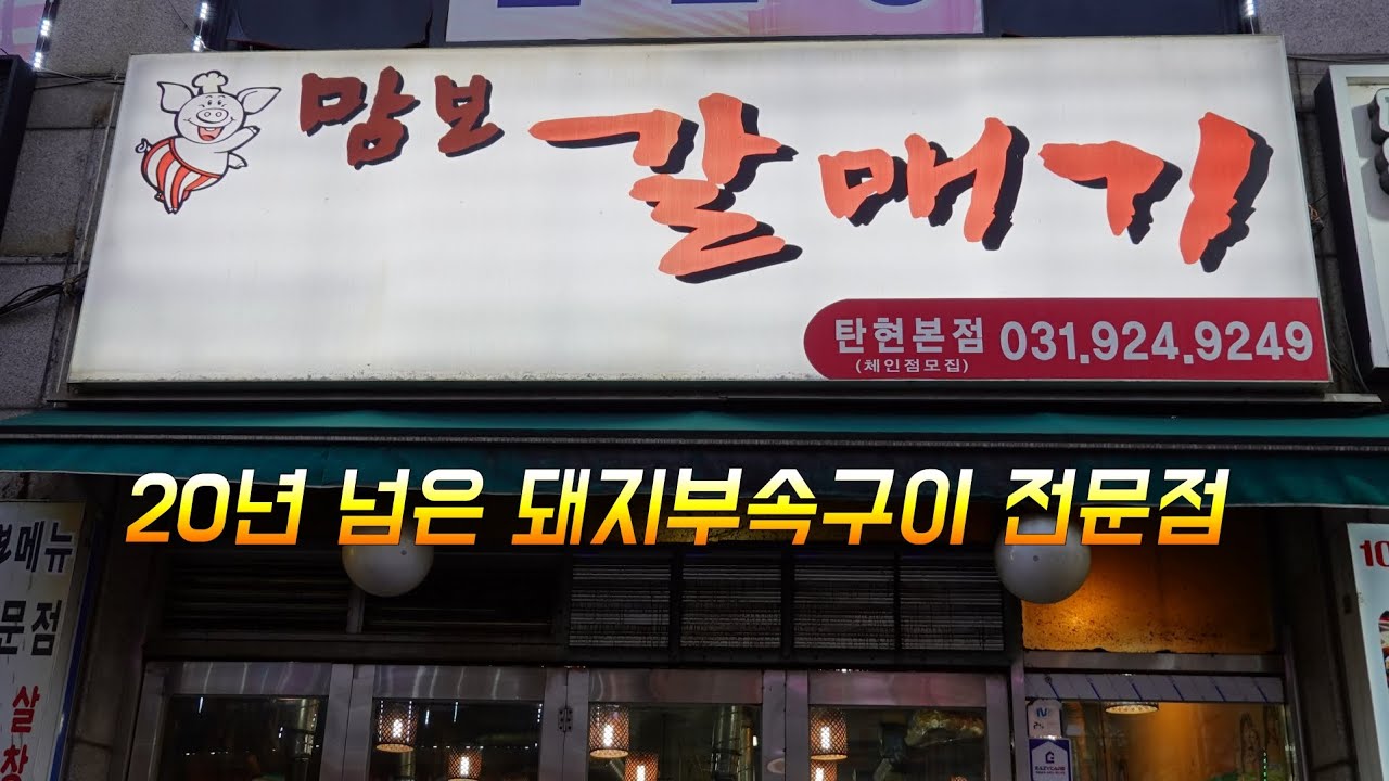 '맘보갈매기'는 일산 탄현에 위치한 고기집으로, 20년 이상의 역사를 자랑하는 노포입니다. 이곳은 부속고기 전문점으로, 다양한 고기 메뉴를 제공하고 있어요. 식당 외관은 아기자기한 디자인으로, 귀여운 돼지 셰프 캐릭터가 그려진 간판이 인상적이에요.