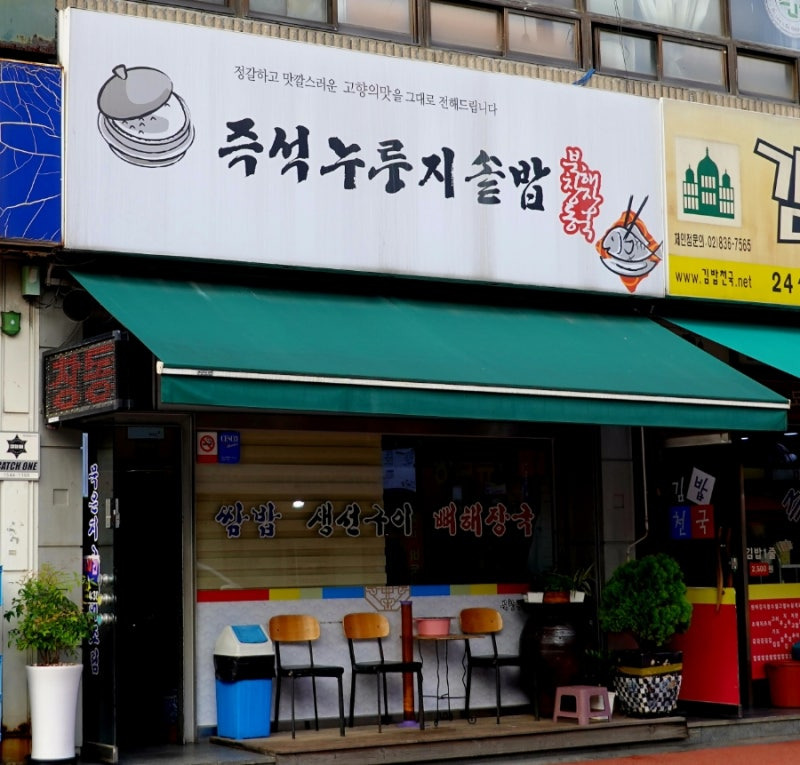 식당의 간판에는 '북창동 해장국'이라는 이름이 큼지막하게 적혀있고, 주변에는 나무 의자와 화분이 놓여 있어요. 이곳은 편안한 분위기에서 식사를 즐길 수 있는 곳이에요.