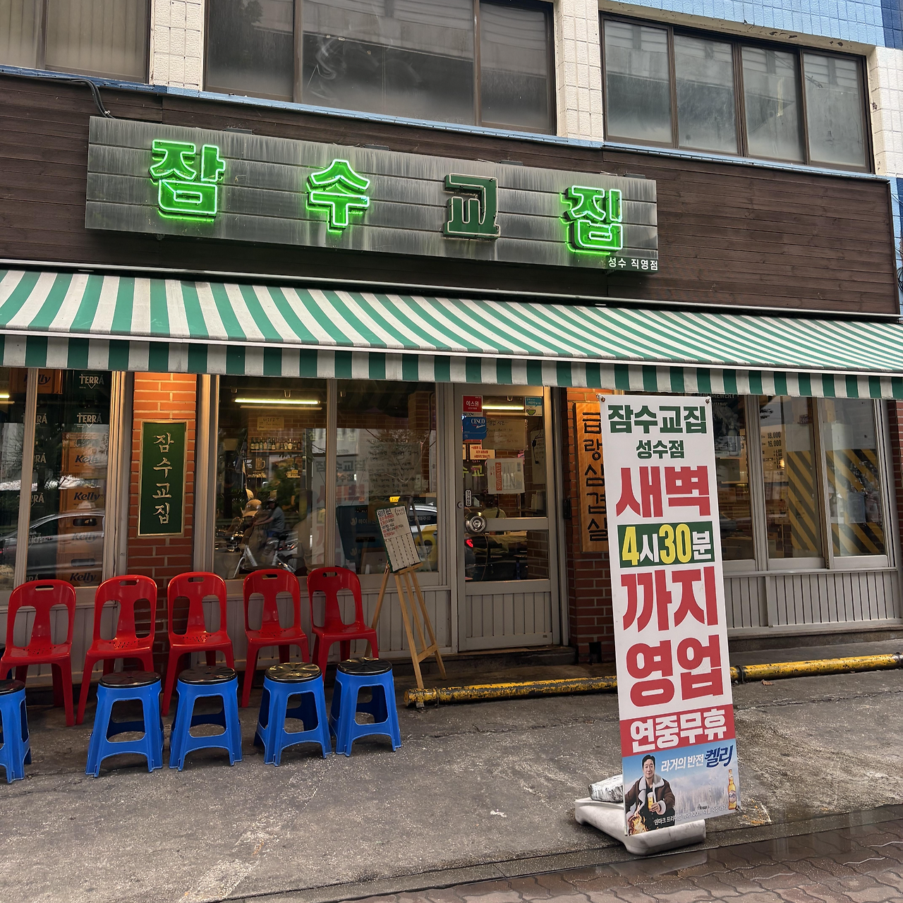 가게 앞에는 빨간색과 파란색 플라스틱 의자들이 정돈되어 있어, 언제든지 편하게 앉아 식사를 즐길 수 있는 분위기랍니다. 내부는 깔끔하고 소박한 인테리어로, 편안한 식사 시간을 보낼 수 있어요.