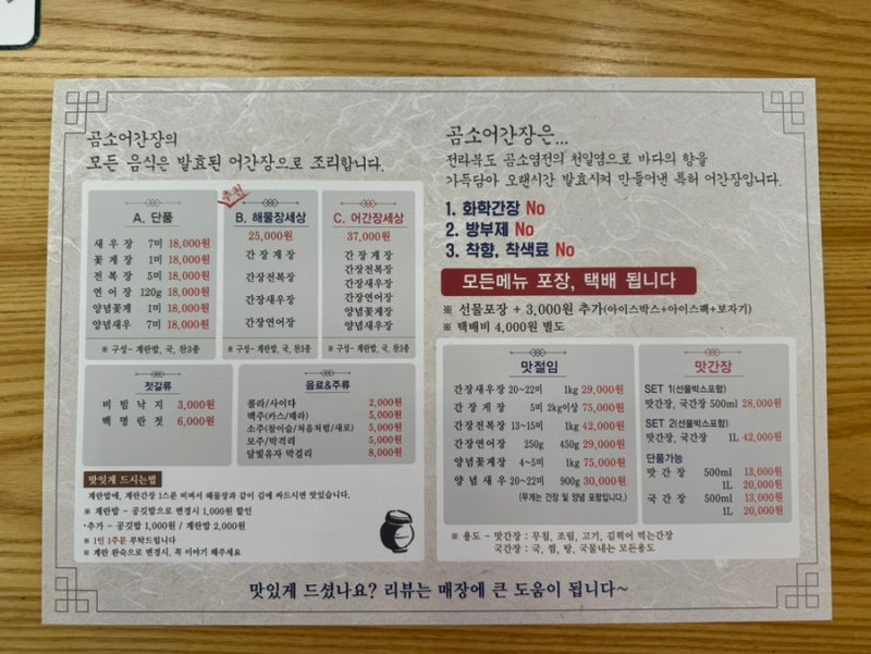 이곳의 대표 메뉴는 간장게장인데요, 신선한 게를 간장에 재워 깊은 맛을 내고 있어요. 가격은 1인분에 약 25,000원 정도로, 양도 푸짐해요. 그 외에도 해물공식 세트가 인기인데, 다양한 해산물을 한 번에 즐길 수 있어요. 세트 가격은 약 50,000원으로, 여러 가지 해산물을 맛볼 수 있는 기회가 되죠.