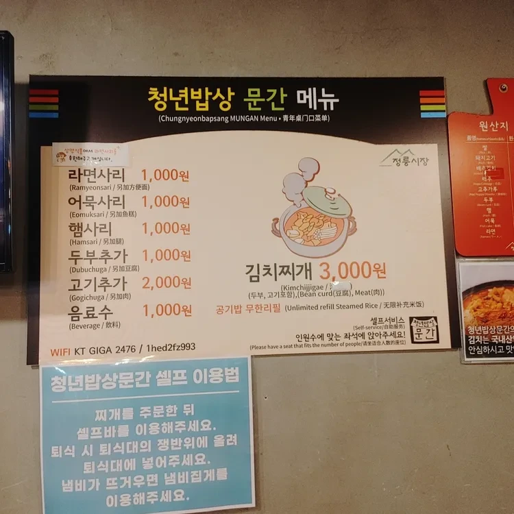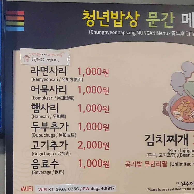 청년시장 문간의 메뉴는 다양해요. 가장 인기 있는 메뉴는 김치찌개로, 가격은 3,000원이에요. 이 외에도 라면사리, 햄사리, 두부 추가 등 다양한 옵션이 있어요. 각 추가 메뉴는 1,000원에서 2,000원 사이로 저렴하게 제공되죠.