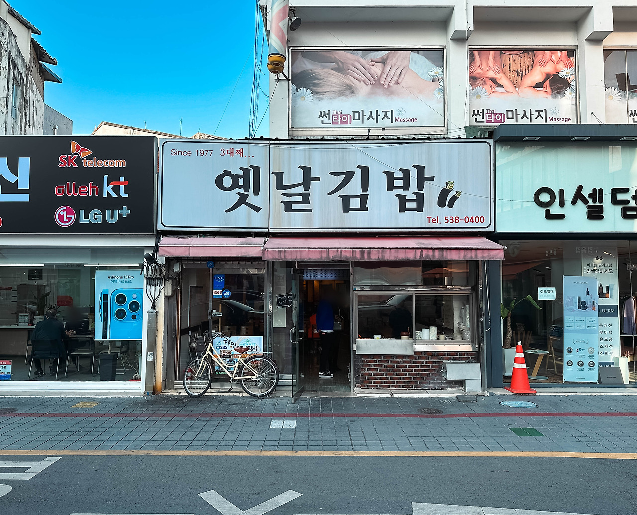 외관은 깔끔하고 아늑한 느낌을 주며, 간판에는 '옛날김밥'이라는 이름이 큼지막하게 적혀 있어 쉽게 찾을 수 있어요. 주변에는 통신사 광고와 마사지 가게가 있어, 다양한 볼거리가 있는 거리랍니다. 이곳은 특히 아침 일찍부터 영업을 시작해 많은 사람들이 찾는 인기 있는 분식집이에요.