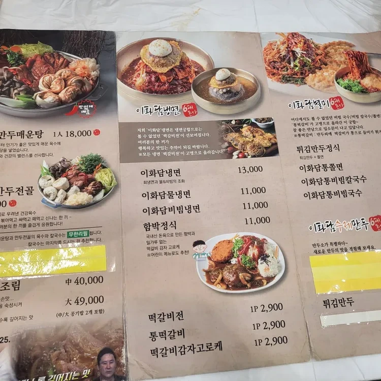 이화당의 메뉴는 다양하지만, 특히 추천하고 싶은 메뉴는 갈비탕과 이화담냉면이에요. 갈비탕은 깊고 진한 국물 맛이 일품이며, 가격은 18,000원이에요. 이화담냉면은 시원하고 상큼한 맛으로 여름철에 특히 인기가 많고, 가격은 11,000원이랍니다.