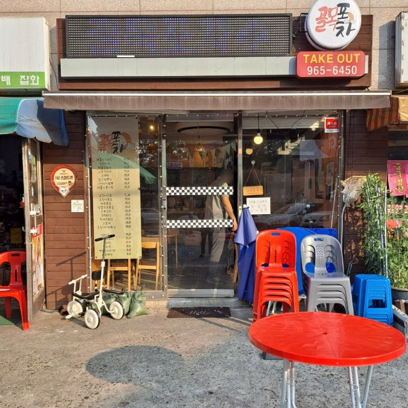 입구에 들어서면 화려한 네온사인과 함께 아늑한 분위기가 반겨줘요. 작은 원형 테이블과 플라스틱 의자들이 놓여 있어, 편안하게 앉아 음식을 즐길 수 있는 공간이 마련되어 있어요.