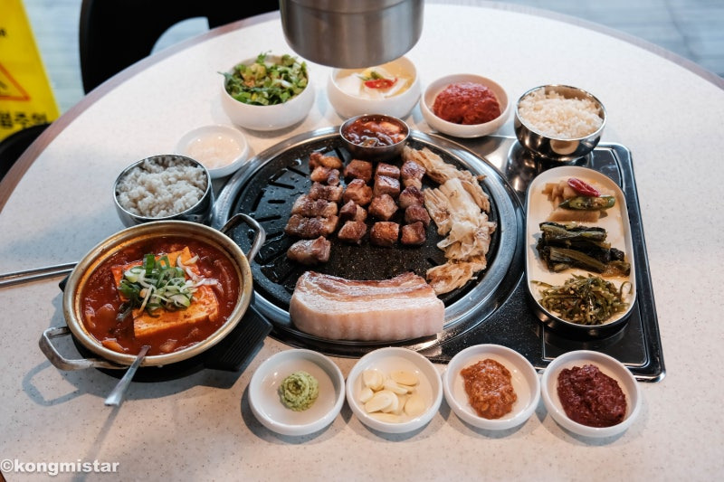 고기와 함께 곁들일 수 있는 반찬들도 다양하게 준비되어 있어요. 김치, 무생채, 그리고 고소한 된장찌개까지, 모든 것이 잘 어우러져서 한 끼 식사로 부족함이 없답니다.