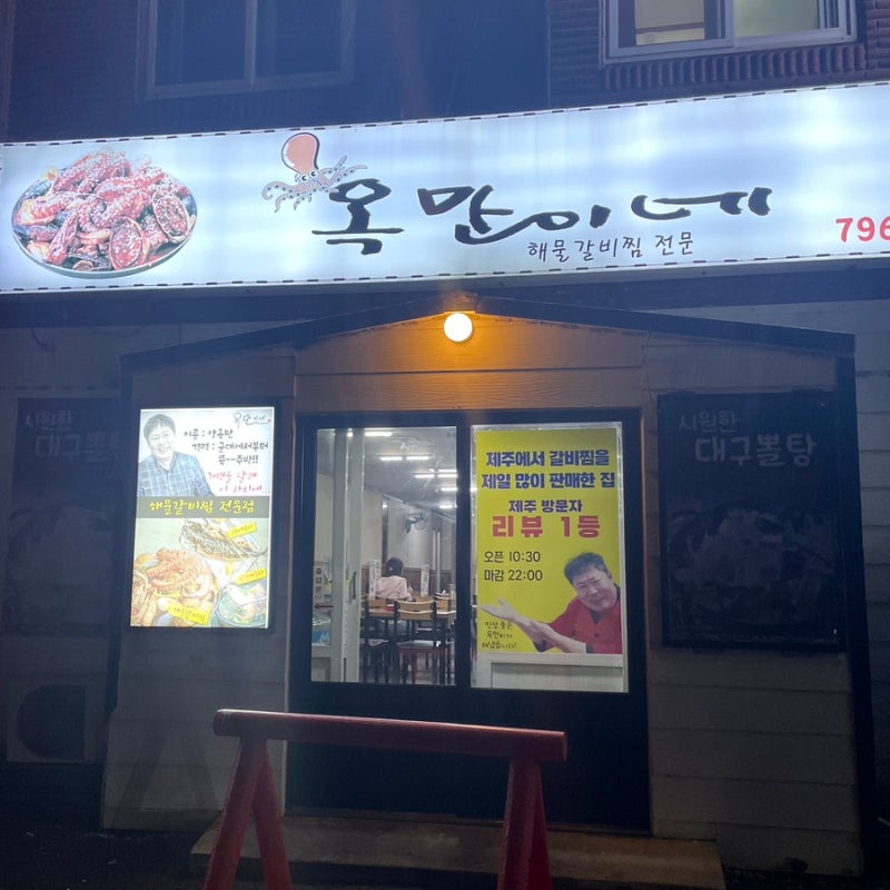 옥만이네는 제주도 금능협재에 위치해 있어요. 바다와 가까운 곳에 자리 잡고 있어서 신선한 해산물을 즐기기에 최적의 장소랍니다. 외관은 아기자기한 해물 그림과 함께 밝고 화사한 간판이 눈에 띄어요.