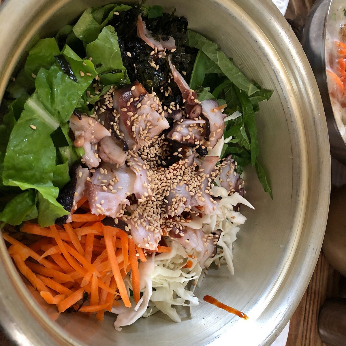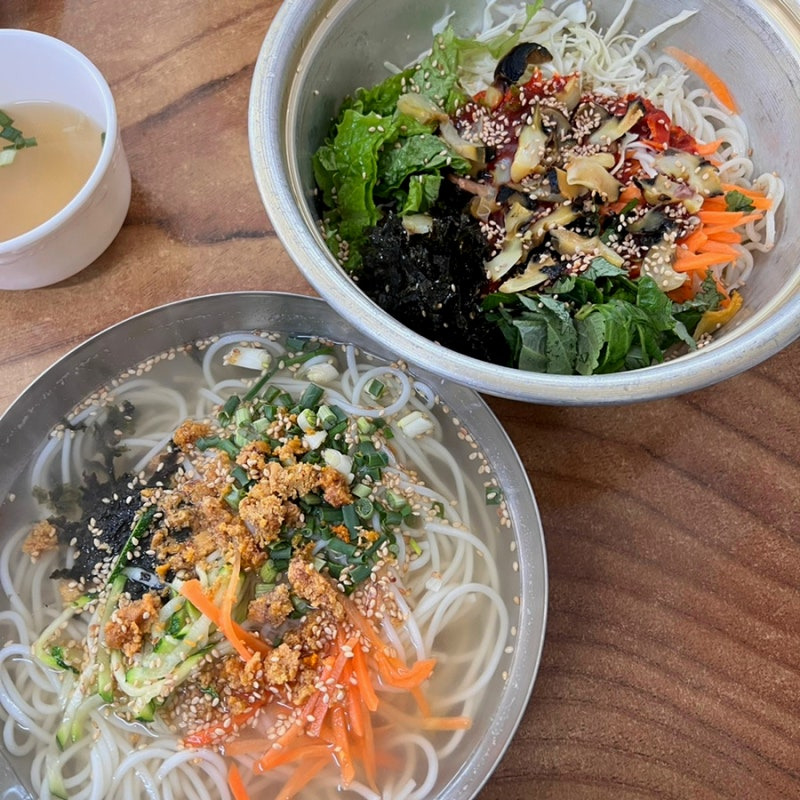 비빔국수는 매콤한 양념이 잘 배어 있어, 입맛을 돋우는 데 제격이에요. 돌문어부침채는 바삭한 식감과 함께 신선한 해산물의 맛을 느낄 수 있어, 함께 곁들여 먹으면 더욱 좋습니다.