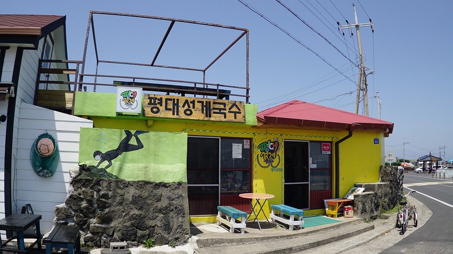 평대성게국수는 제주도 제주시 구좌읍 평대리에 위치해 있습니다. 이곳은 바다와 가까운 위치에 있어, 신선한 해산물을 쉽게 접할 수 있는 장점이 있어요. 식당 외관은 밝은 노란색으로 꾸며져 있어 눈에 띄며, 벽면에는 다이버의 귀여운 벽화가 그려져 있어요.