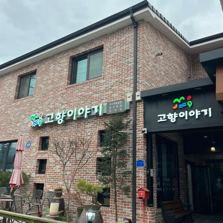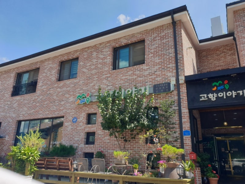 고향이야기는 제천의 중심가에 위치해 있어 접근성이 매우 좋아요. 이곳은 외관부터 아늑한 느낌을 주는데, 벽돌로 지어진 건물에 큰 창문과 아기자기한 야외 좌석이 마련되어 있어요.