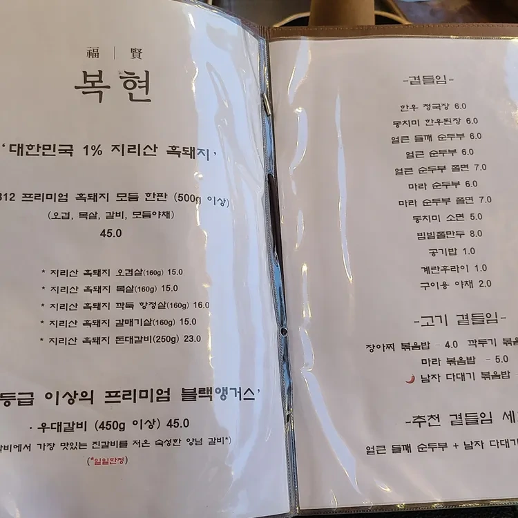 복현의 메뉴는 다양해요. 특히 추천하고 싶은 메뉴는 "지리산 흑돼지"인데, 가격은 45,000원으로 세트 메뉴로 제공돼요. 고기 외에도 다양한 사이드 메뉴가 있어요. 예를 들어, 볶음밥은 8,000원, 그리고 신선한 샐러드는 6,000원이에요.