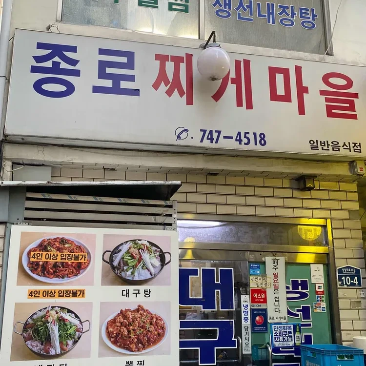 종로찌게마을은 종로3가역에서 가까운 위치에 있어 접근성이 뛰어나요. 식당 외관은 전통적인 한국식 느낌을 주며, 간판에는 '종로찌게마을'이라는 이름이 큼지막하게 적혀 있어요.