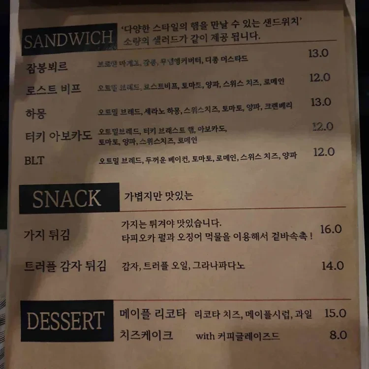 메뉴는 다양하게 구성되어 있어요. 샌드위치, 스낵, 디저트 등 여러 가지가 있는데, 특히 샌드위치 메뉴가 인기가 많아요. 제가 추천하는 메뉴는 'Jam Bomb'와 'Turkey Avocado'인데, 각각 12,000원과 13,000원으로 가격도 적당해요. 스낵으로는 'Truffle Potato Fries'가 정말 맛있어요! 가격은 16,000원이에요. 디저트로는 'Cheesecake'가 8,000원으로 가볍게 즐기기 좋답니다.