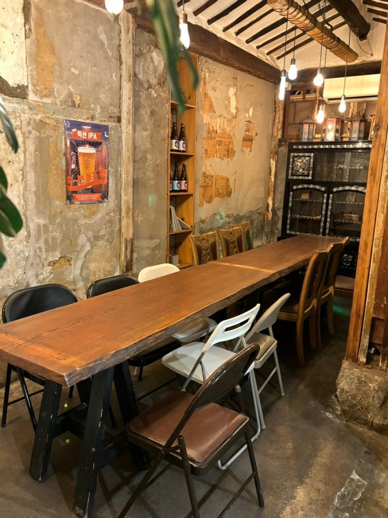 에일당의 인테리어는 정말 매력적이에요. 한옥의 전통적인 요소와 현대적인 감각이 잘 어우러져 있어요.