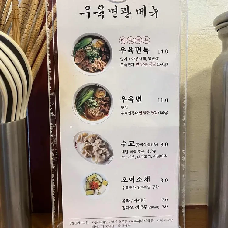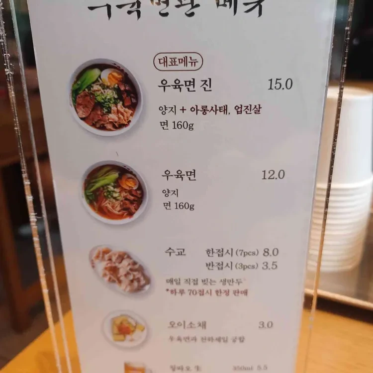 또한, '우육면'은 12,000원으로 기본적인 우육면을 즐길 수 있는 메뉴에요. 그리고 사이드 메뉴로는 '수교'가 있는데, 7개에 8,000원, 3개에 3,500원으로 제공되며, 정말 맛있어요. 마지막으로 '오이소채'는 3,000원으로 상큼한 맛을 더해주는 사이드 메뉴랍니다.