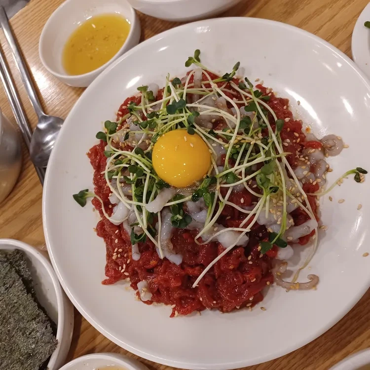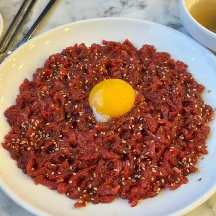 창신육회에서 가장 추천하는 메뉴는 바로 육회예요. 신선한 소고기를 사용하여 만든 육회는 고소한 맛과 함께 씹는 맛이 아주 좋답니다. 육회 위에 올려진 노란 계란 노른자는 풍미를 더해주고, 함께 나오는 소스와 곁들여 먹으면 더욱 맛있어요.