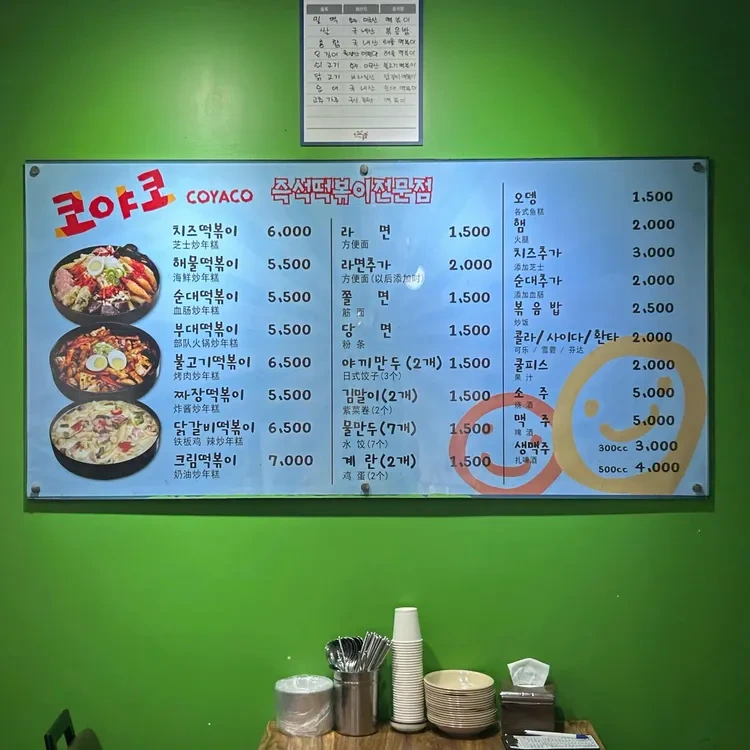 코야코의 메뉴는 정말 다양해요. 특히 추천하고 싶은 메뉴는 바로 '치즈 떡볶이'와 '해물 떡볶이'입니다. 치즈 떡볶이는 쫄깃한 떡과 고소한 치즈가 어우러져 정말 맛있어요. 해물 떡볶이는 신선한 해물이 듬뿍 들어가 있어 해물의 풍미가 가득하답니다. 가격은 각각 6,000원과 7,000원으로, 가성비가 뛰어나요.