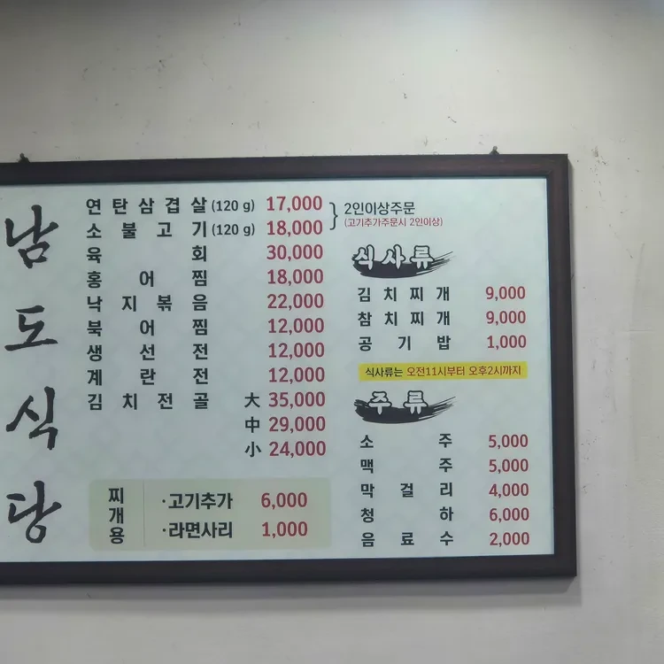 남도식당의 메뉴는 정말 다양해요. 특히 연탄삼겹살이 유명한데, 불맛이 가득 배어 있어 정말 맛있어요.