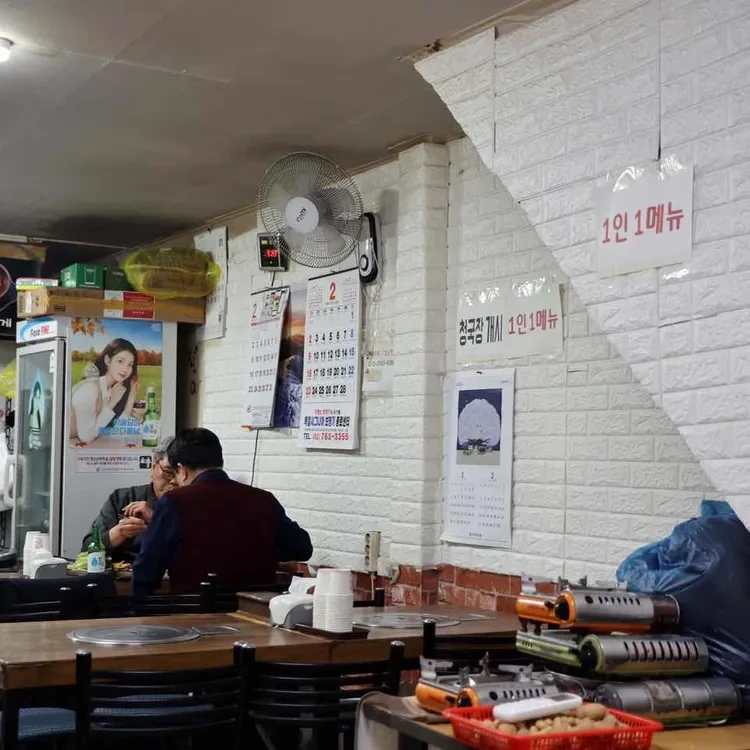 나무 테이블과 의자가 배치되어 있어, 친구나 가족과 함께 오기 좋은 곳이에요. 벽에는 다양한 포스터와 달력이 걸려 있어 소소한 재미를 더해주고, 팬이 설치되어 있어 여름에도 시원하게 식사할 수 있어요.