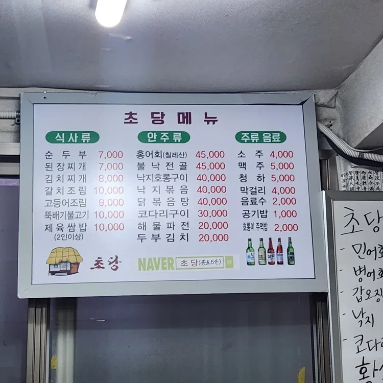 초당의 메뉴는 정말 다양해요. 식사류, 안주류, 주류 음료로 나뉘어져 있는데, 식사류에는 순두부(7,000원)와 제육쌈밥(10,000원)이 있어요. 안주류로는 홍어회(45,000원)와 코다리구이(30,000원)가 인기랍니다. 주류 음료로는 소주(4,000원)와 맥주(5,000원)가 있어요. 메뉴판은 깔끔하게 정리되어 있어서 가격도 쉽게 확인할 수 있어요.