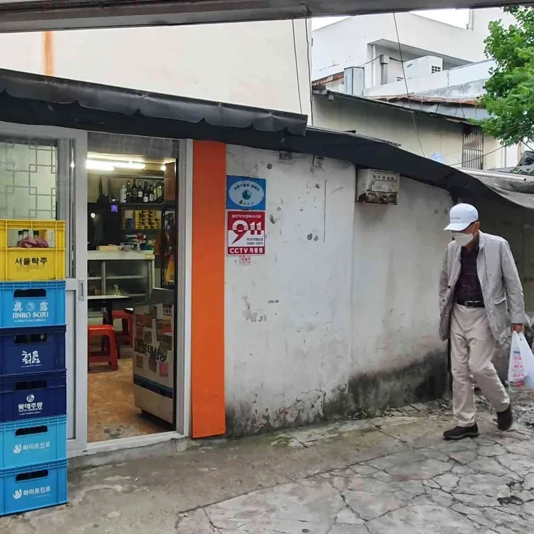가게의 외관은 아담하고 소박해요. 입구에는 다양한 음료수와 간식들이 진열되어 있어, 지나가는 사람들의 시선을 끌어요. 특히, 진로 소주가 쌓여 있는 모습은 이곳이 술집이라는 것을 한눈에 알 수 있게 해줘요. 내부로 들어가면, 따뜻한 조명 아래에서 손님들이 편안하게 앉아 있는 모습을 볼 수 있어요.