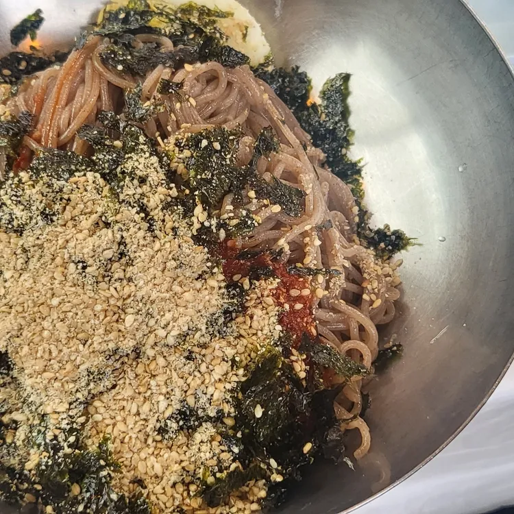막국수는 다양한 토핑과 함께 제공되는데, 특히 반숙 계란과 김가루가 올라가 있어요. 이 조합이 정말 맛있어요. 그리고 동치미는 별도로 주문할 수 있는데, 이 또한 꼭 드셔보시길 추천해요. 가격은 3,000원 정도로 저렴하답니다.