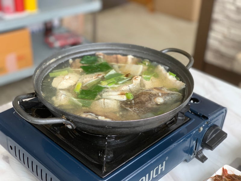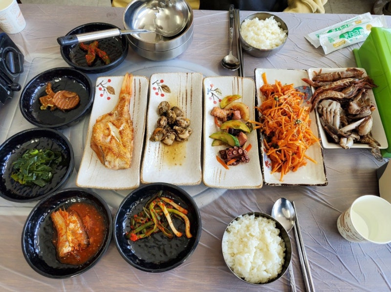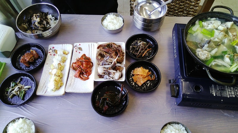 주문진 어촌계의 해물탕과 다양한 반찬들