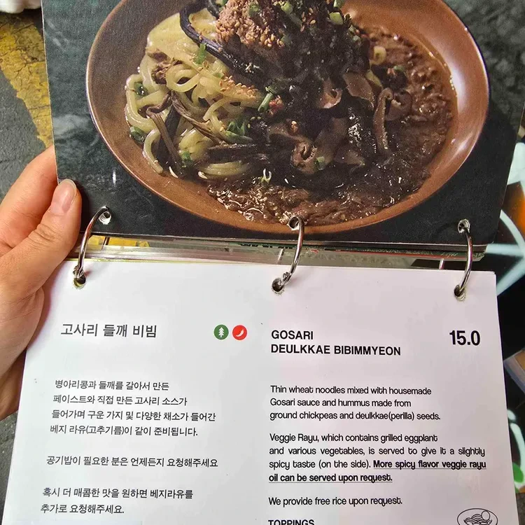 고사리익스프레스의 메뉴는 정말 다양해요. 그 중에서도 제가 추천하고 싶은 메뉴는 '고사리들깨비빔면'이에요. 이 메뉴는 얇은 밀면에 고사리 소스와 병아리콩으로 만든 후무스를 섞어 먹는 비빔면이에요. 가격은 15,000원이랍니다.