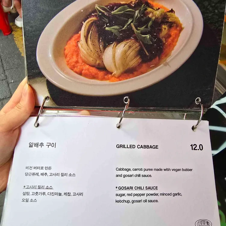 또한, '구운 양배추'도 추천해요. 이 메뉴는 구운 양배추와 양파가 함께 나오는 요리로, 가격은 12,000원이에요. 당근 퓨레 위에 올려져 나와서 비주얼도 정말 예쁘답니다.