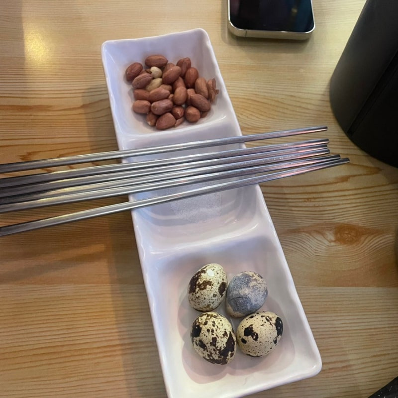 고소한 땅콩과 구운 메추리알이 담긴 접시입니다.