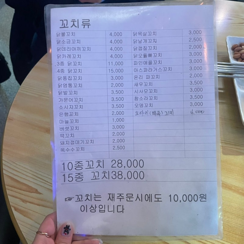 다구라의 가장 큰 매력 중 하나는 다양한 꼬치 메뉴에요. 메뉴판을 보면 여러 종류의 꼬치가 준비되어 있는데, 특히 닭불꼬치가 인기랍니다. 가격은 4,000원으로 저렴하면서도 맛이 좋아요. 그 외에도 소금꼬치, 야채꼬치 등 다양한 옵션이 있어 선택의 폭이 넓어요.
