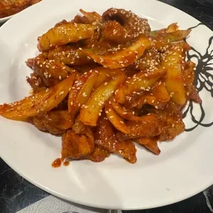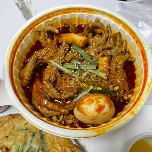 불꽃닭발은 매운 양념으로 버무린 닭발 요리로, 한국의 대표적인 안주 중 하나예요. 이곳의 불꽃닭발은 매운맛이 강하면서도 깊은 풍미를 자랑해요. 특히, 고소한 참깨가 뿌려져 있어 더욱 맛있답니다.