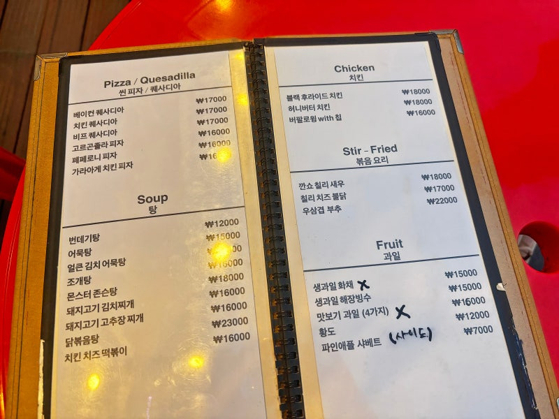 스코어포차의 메뉴는 정말 다양해요. 피자, 퀘사디아, 치킨, 볶음 요리, 수프, 과일 등 여러 가지가 준비되어 있답니다. 특히, 베이컨 피자와 블랙 화라이드 치킨은 많은 손님들이 추천하는 인기 메뉴에요. 가격대는 적당해서 부담 없이 즐길 수 있어요. 예를 들어, 베이컨 피자는 약 12,000원, 블랙 화라이드 치킨은 15,000원 정도로, 가성비가 뛰어난 편이에요.