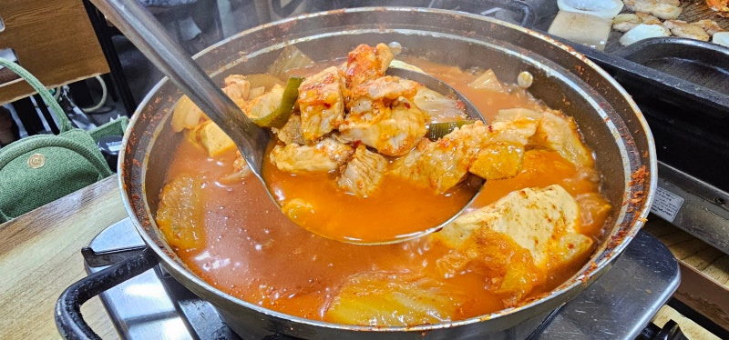 김치찌개가 나오고, 고기를 구워서 쌈을 싸먹으니 정말 맛있더라고요. 국물의 깊은 맛과 고기의 풍미가 어우러져서 한 그릇이 순식간에 비워졌어요.