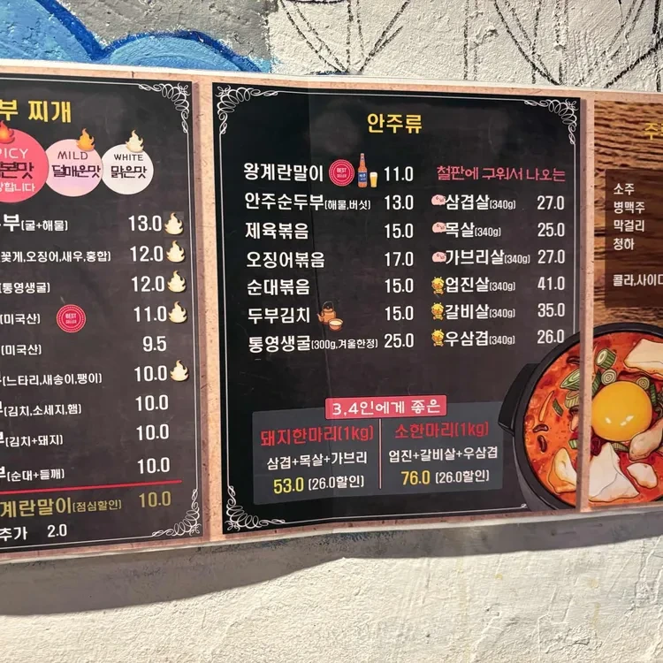 메뉴판에는 다양한 옵션이 있어, 안주순두부, 제육볶음, 삼겹살 등 여러 가지를 선택할 수 있어요. 가격대는 9,500원에서 27,000원까지 다양하니, 여러 사람과 함께 가면 여러 가지를 시켜서 나눠 먹는 것도 좋겠죠?