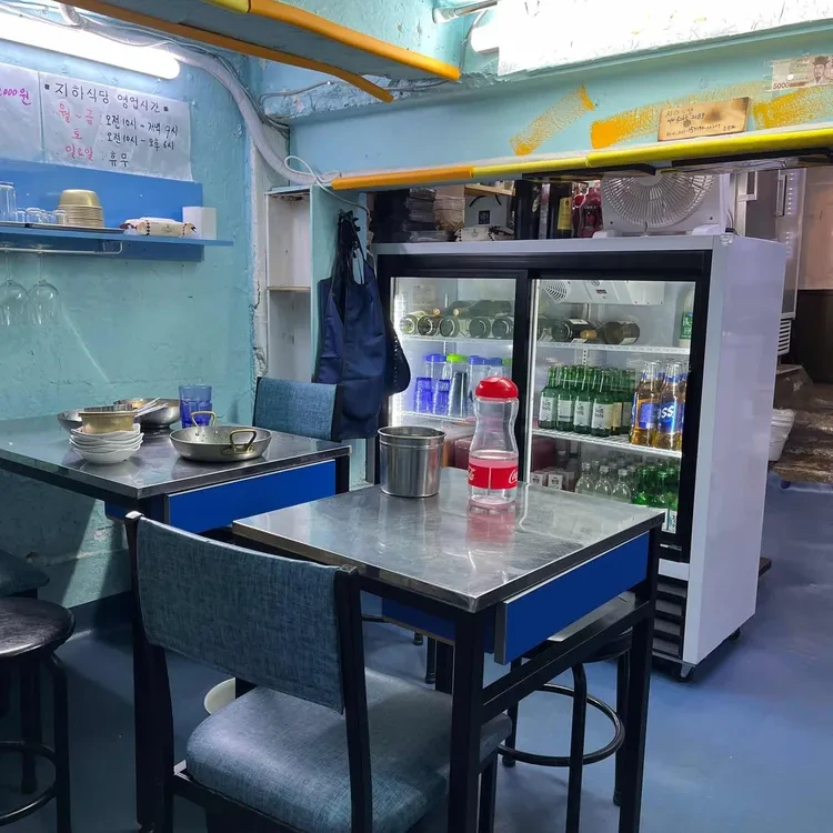 지하식당의 내부는 아늑하고 편안한 분위기를 자아내요. 벽은 파란색으로 칠해져 있고, 금속 테이블과 의자가 배치되어 있어요.