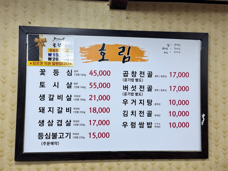 호림정의 메뉴는 다양하고 가격도 합리적이에요. 대표적인 메뉴로는 꽃등심, 토시살, 생갈비살, 돼지갈비, 생삼겹살 등이 있어요. 가격은 꽃등심이 45,000원, 토시살이 55,000원, 생갈비살이 21,000원, 돼지갈비가 18,000원, 생삼겹살이 17,000원, 등심불고기가 15,000원이에요.