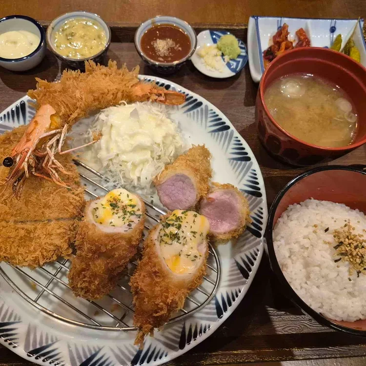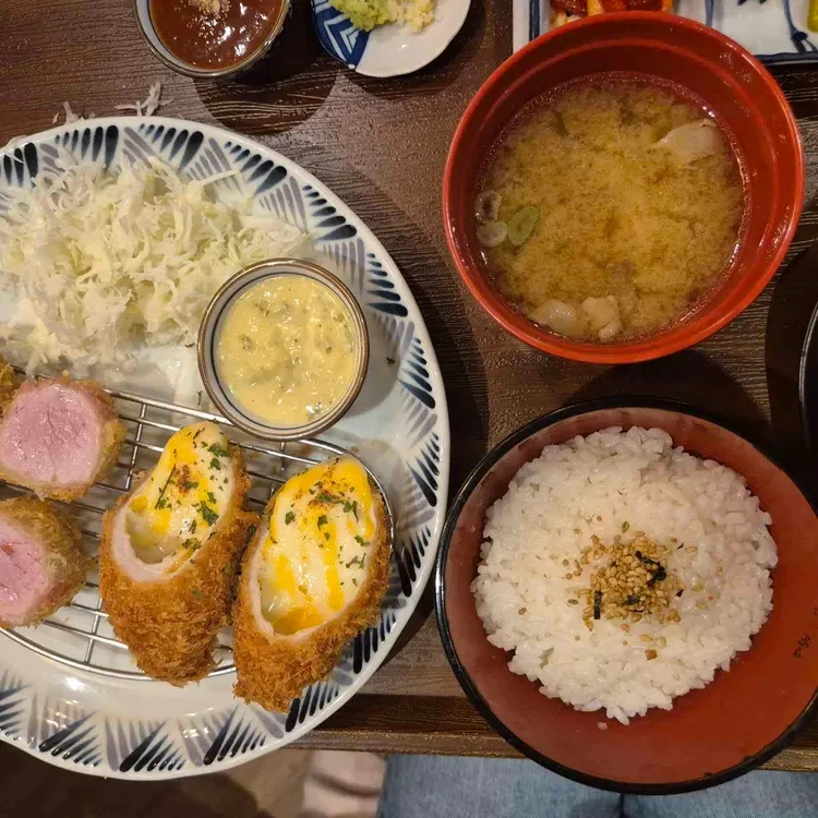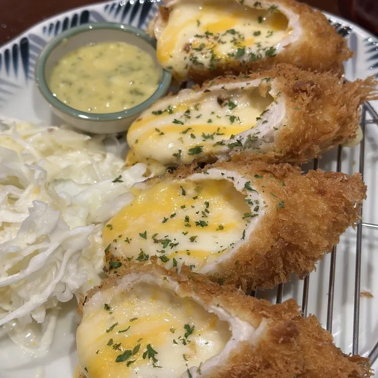 주요 메뉴 중 하나인 치킨 카츠는 바삭한 튀김옷과 부드러운 치킨이 조화를 이루며, 속에는 고소한 치즈가 가득 차 있어요.